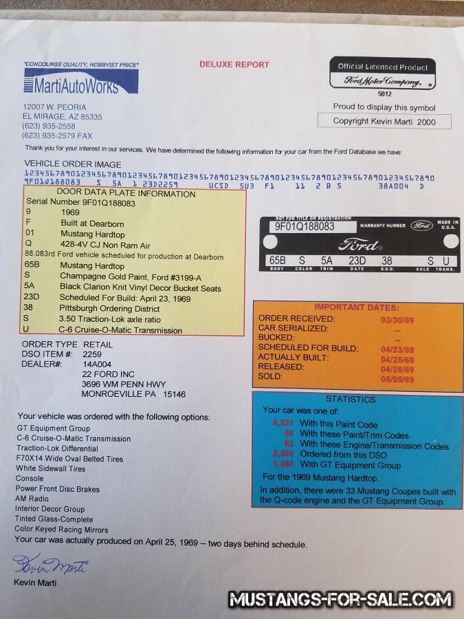 Q- Code, C-6 tranny, 3.50 nodular rearend. PPG Sunset red, original color was Champaign Gold. No trades, price is firm. Lots of extras. call or text for details and more pictures. I have a Kevin Marti report, article in Mustangs times, build sheet, owners manual, shop manuals and more.